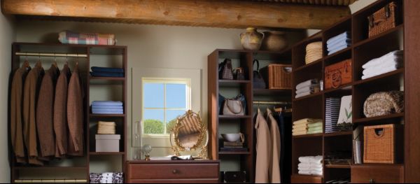 - Choose a color that matches your bath decor. Often when a master walk-in closet is part of a master suite the bath is closet at hand so extending the color and style to the closet works very well. Whether your bath is natural maple cabinets or dark espresso there is probably a closet component color that will offer a very close match. Be mindful of door styles and crown molding details. Your closet will become an integrated compliment to your home's decor, rather than looking like an ill-matched after thought.